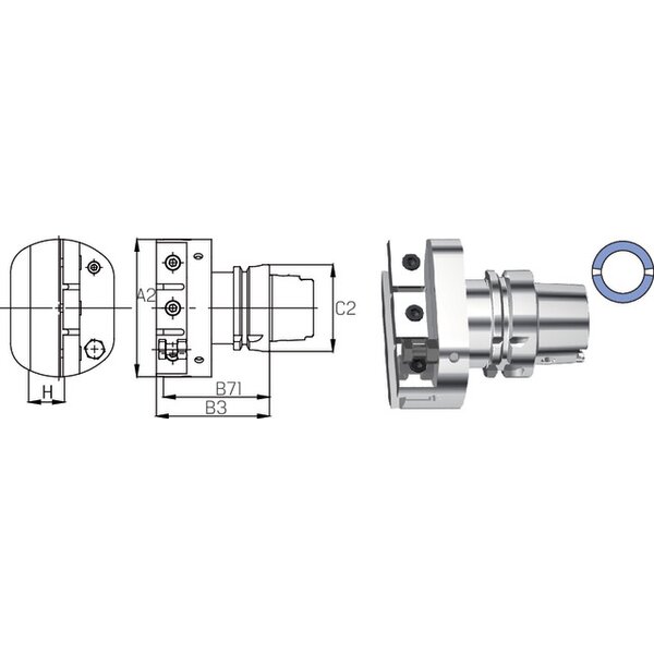 - Ausführungzur Aufnahme von Stechschwertern, mit Innenkühlung, Mitnehmernuten am HSK nach ICTM-Standard, Kühldüse beidseitig montierbar