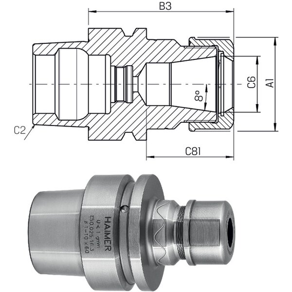 - auch für Standard-Spannzangen ER nach ISO 15488 (Achtung: Bei Verwendung mit Standard-Spannzangen wird das B3-Maß länger)