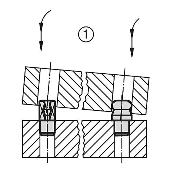 Die Aufnahmebolzen mit Kugelansatz erleichtern den Fügevorgang, da sie fügegerecht gestaltet sind. Die Klemmneigung, auch Schubladeneffekt genannt, die durch schräges Aufsetzen des Fügeteils oder durch nicht in der Bolzenachse wirkende Kräfte beim Aufschieben hervorgerufen wird, wird durch den Kugelansatz und die sich anschließende Fügeschräge minimiert (siehe auch Fügeschema 1, 03108 Form B).
