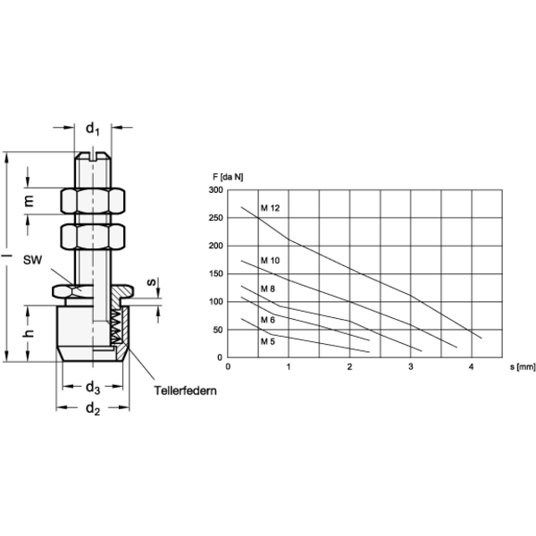 Dazu wird mit der Sechskantschraube (SW) die Vorspannung der Tellerfedern verändert. Die Einschraubtiefe s ist ein Maß für die Vorspannung bzw. für die Spannkraft, die im Schaubild abgelesen werden kann.