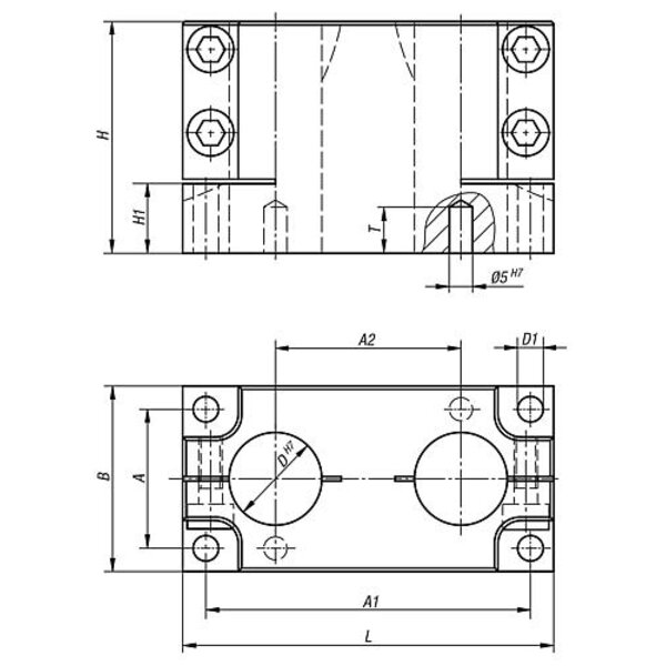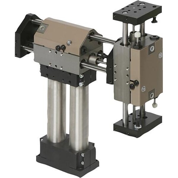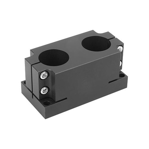 Sockel doppelt zur Aufnahme von Säulen in vier verschiedenen Größen. Bearbeitete Auflageflächen mit integrierten Montage- und Zentrierbohrungen garantieren die positionsgenaue Montage der Elemente.
