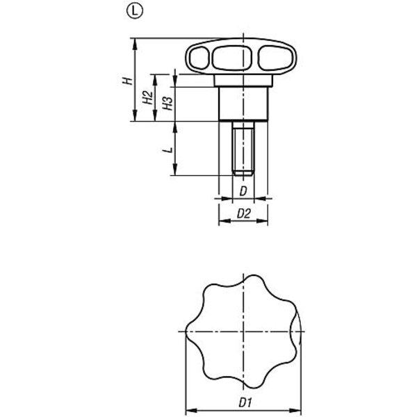 STERNGRIFF MIT VORSTEHENDER BUCHSE D=M08X40, D1=40 H=25, FORM:L, DUROPLAST SC...