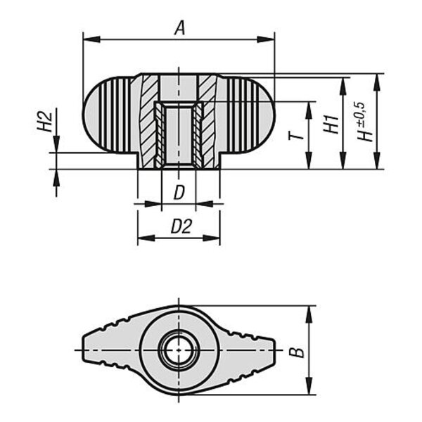 FLÜGELGRIFF MINIWING 1/4-20, FORM:D INNENGEWINDE DURCHGEHEND, A=28, B=13, H=1...
