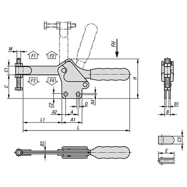 SCHNELLSPANNER HORIZONTAL STANDARD, FUß SENKRECHT F2=3400, VOLLER HALTEARM M08X60, STAHL VERZINKT, KOMP:KUNSTSTOFF