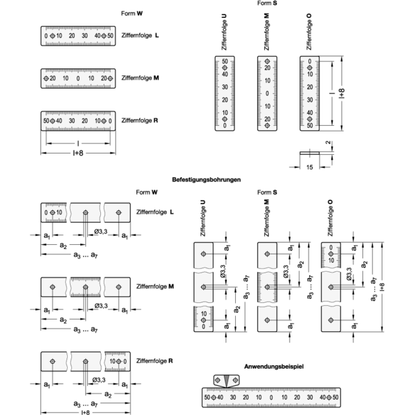 An Maßstäben GN 711.2 lassen sich z. B. Positionen von Verfahrschlitten sehr leicht ablesen. Der schwarze Hintergrund bildet einen hohen Kontrast zu den naturfarbenen Ziffern und Skalen und blendet nicht.