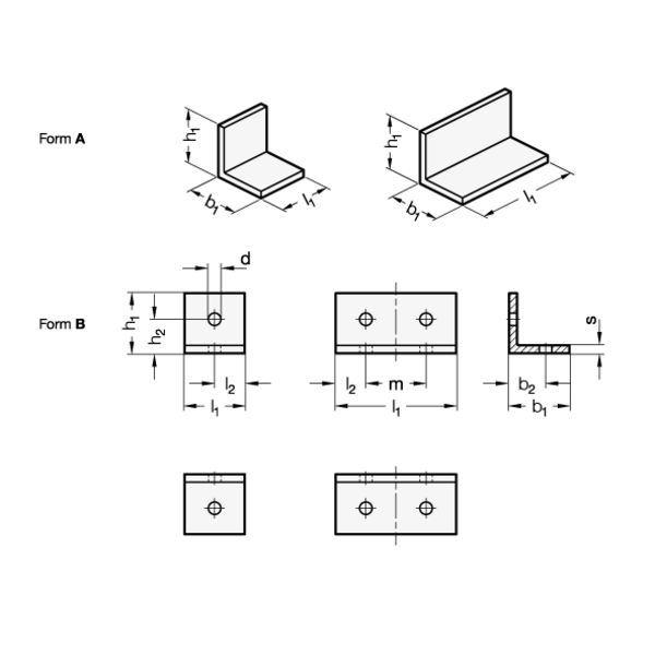 Die Montagewinkel der Form B sind in Abhängigkeit der Länge l1 mit 2 oder 4 Bohrungen versehen.