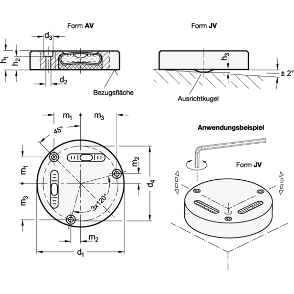 Die Libellen der Form JV werden beim Montieren über die um 120° versetzt angeordneten Befestigungsbohrungen ausgerichtet. Eine Ausrichtkugel an der Unterseite dient dabei als Kipppunkt. Durch gezieltes Anziehen lässt sich die Neigungsposition erreichen, bei der sich die Blasen innerhalb der mittigen Markierungsstriche befinden.