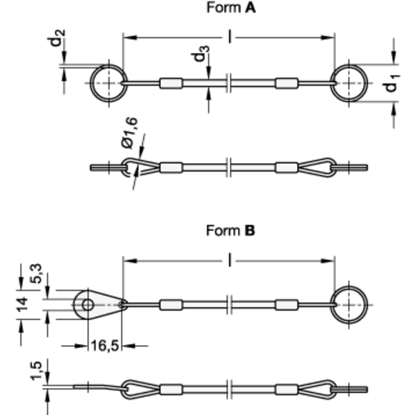 Die Schlüsselringe werden am Halteseil montiert geliefert. Bei Form A besitzen beide Ringe den gleichen Durchmesser d1.