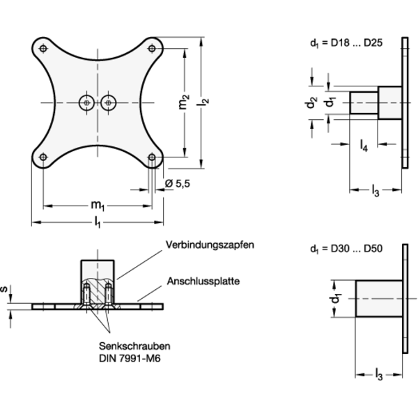 Die Verbindungszapfen lassen sich innerhalb des Rohrklemmverbinder-Programmes mit den verschiedensten Bauteile kombinieren, um unterschiedlichste Befestigungsvarianten, Freiheitsgrade und Verstellmöglichkeiten zu realisieren.