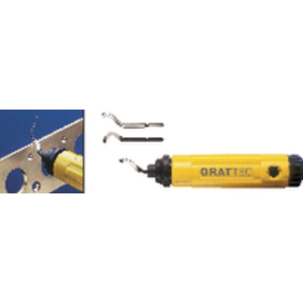 - je eine Klinge GT-E100 (HSS) für Stahl, Aluminium und Kunststoff, GT-E200 (HSS) für Messing und Guss und GT-E300 (HSS) für Innen- und Außengrat an Bohrungen in Blechen und Rohren