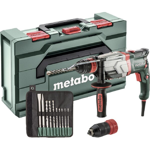 Hammerfutter für Werkzeuge mit SDS-plus-Einsteckende, Schnellspannbohrfutter für Werkzeuge mit zylindrischem Schaft, gummierter Zusatzhandgriff, Bohrtiefenanschlag, SDS-plus-Bohrer-/Meißelsatz (10-teilig) und metaBOX 145 L.