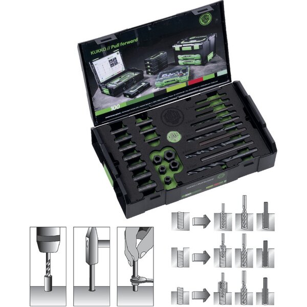 - komplett mit Schraubenausdrehern, HSS-Spiralbohrern und Bohrer-Führungsbüchsen für das problemlose Anbohren auch tief in Gewindelöchern abgebrochener Teile