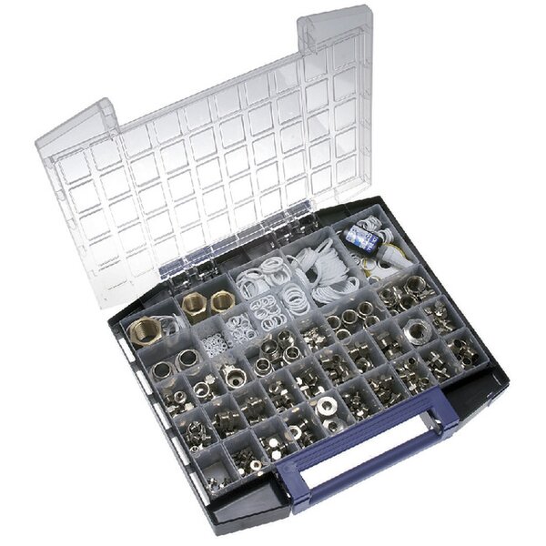 - Ausführung744-teiliger Sortimentskoffer mit 182 Verschlusstopfen, Reduziernippeln, Doppelnippeln und Muffen M 5 bis G 1“