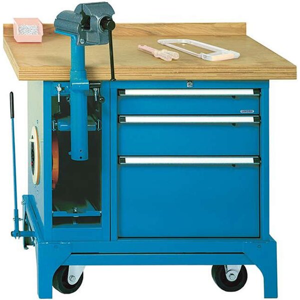 - Arbeitshöhe: 850 mm Schraubstock In Arbeitsstellung stabil und vibrationsfrei mit der Werkbank verbunden. Mit wenigen Handgriffen in den Unterbau versenkbar.