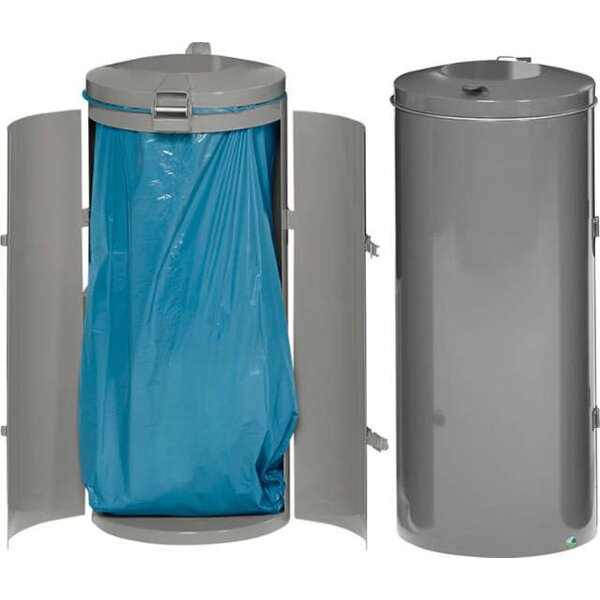 -Abfallsammler, mit Doppeltür Dieser Abfallsammler ist für Papier- und Plastiksäcke. Er ist mit einer Doppeltür und einem Metalldeckel ausgerüstet.