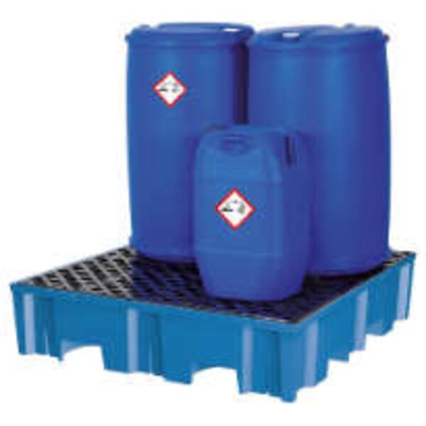-Auffangwanne, aus Polyethylen Diese Auffangwannen sind zur vorschriftsmäßigen Lagerung gewässergefährdender Flüssigkeiten aller Gefährdungsklassen zugelassen. Sie sind hochbeständig gegen Öle, Säuren, Laugen und andere aggressive Stoffe.