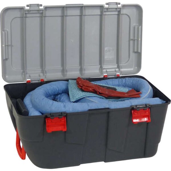 -75-Liter-Notfallset, mit fahrbarem Behälter Diese mobilen Notfallsets kommen überall da zum Einsatz, wo Gefahrstoffe auslaufen können.