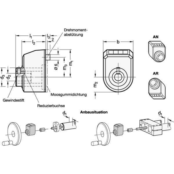 Stellungsanzeiger GN 9534 sind für den Anbau an konfigurierbaren Lineareinheiten vorgesehen. Sie werden mithilfe einer Reduzierbuchse und einem Gewindestift auf den Spindelzapfen der Lineareinheit montiert. Das direkt angetriebene Zählwerk mit digitaler Positionsangabe ist auf die Steigung der Gewindespindel abgestimmt.