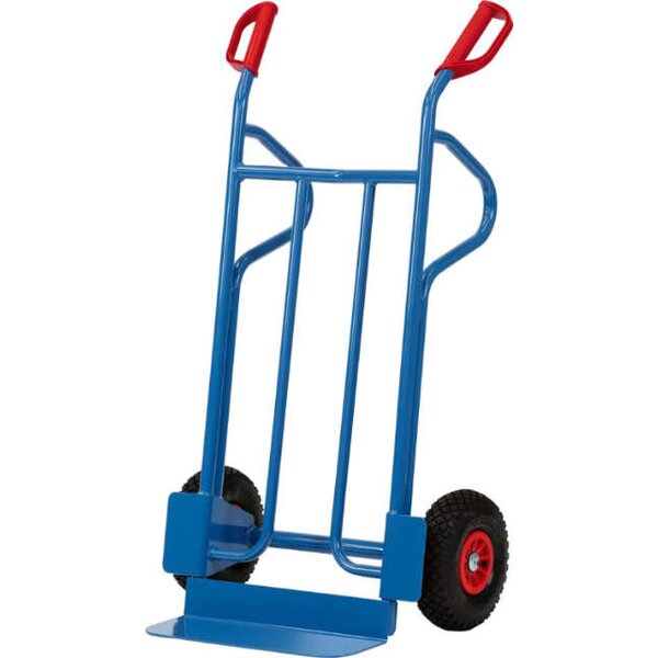-Stahlrohrkarre (Sack- und Stapelkarre) mit Luftbereifung Robuste Sack- und Stapelkarren mit gebogenen Anlagebügel zum sicheren Transportieren von runden Güter wie Rollen, Kannen, Eimer usw.. Die Karre lässt sich bei Beladung mit hohen, kastenförmigen Gütern komfortabel in Fahrstellung kippen, da wegen des durchgebogenen oberen Anlagebügels Platz zum Eingreifen zwischen Bügel und Transportgut bleibt.