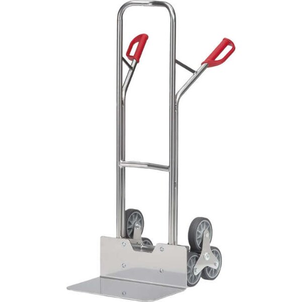 -Aluminium-Treppenkarren Durch die gebogenen Anlagebügel lassen sich runde Güter wie Rollen, Kannen, Eimer etc. mit den Treppenkarren sicher transportieren. Hohe, kastenförmige Güter lassen sich komfortabel in Fahrstellung kippen, da wegen des durchgebogenen oberen Anlagebügels Platz zum Eingreifen zwischen Bügel und Transportgut bleibt.