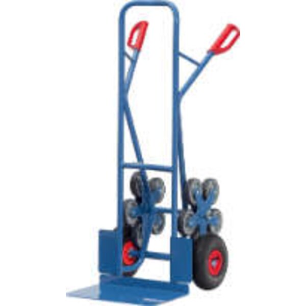 -Stahlrohr-Treppenkarren Durch die gebogenen Anlagebügel lassen sich runde Güter wie Rollen, Kannen, Eimer etc. mit den Treppenkarren sicher transportieren. Hohe, kastenförmige Güter lassen sich komfortabel in Fahrstellung kippen, da wegen des durchgebogenen oberen Anlagebügels Platz zum Eingreifen zwischen Bügel und Transportgut bleibt.