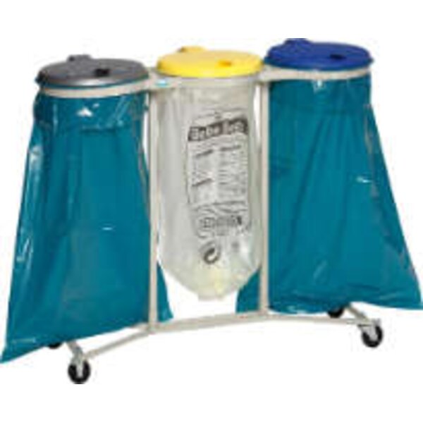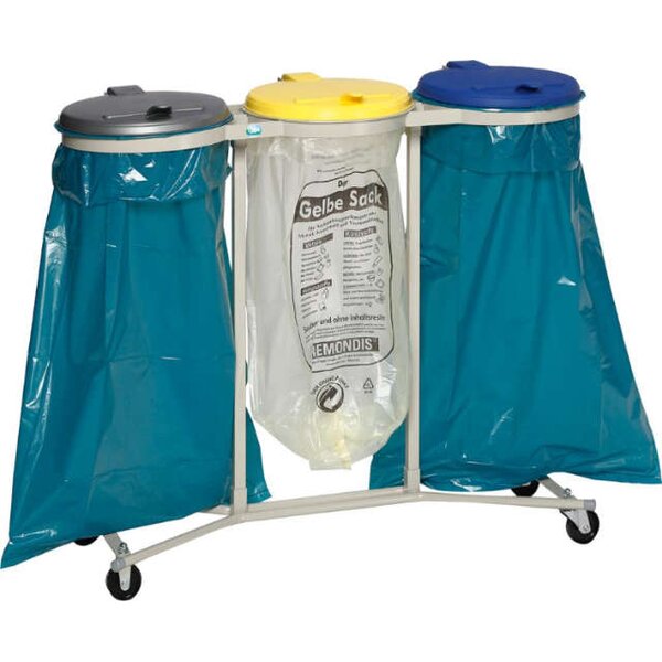 -Abfallsammler Dreifach-Ständer Zur optischen Trennung von Wertstoffen hat dieser 3-fach Abfallsammler unterschiedliche Deckelfarben.