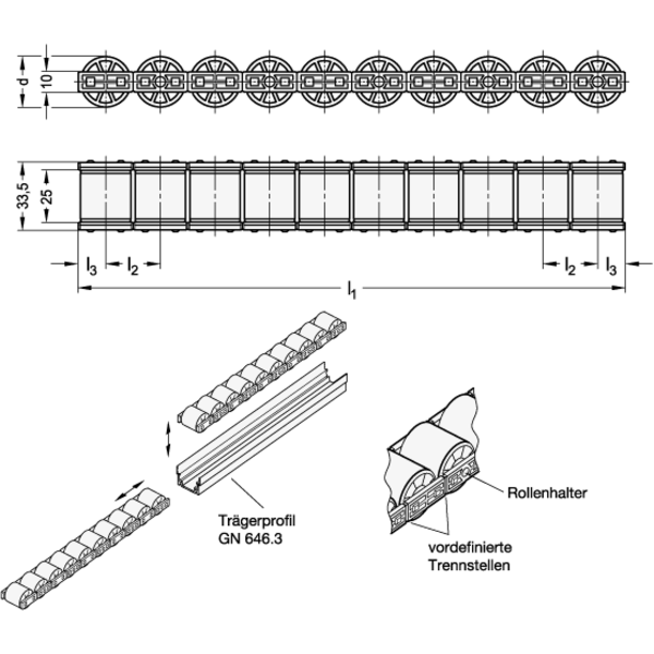 Rollenleisten GN 646.1, eingesetzt in Trägerprofilen GN 646.3 aus Aluminium, bilden Rollenschienen für Anwendungsfälle wie Durchlaufregale, Verpackungs - und Kommissioniertische und Verkettungen von Arbeitsstationen.