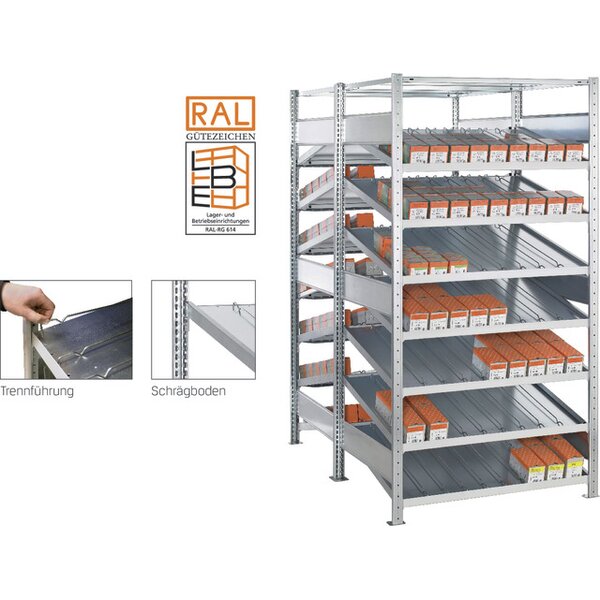 -Schrägboden-Anbauregal Dieses Regal bietet bessere Übersicht und schnelleren Zugriff auf die Lagerware. Es ist beidseitig nutzbar.