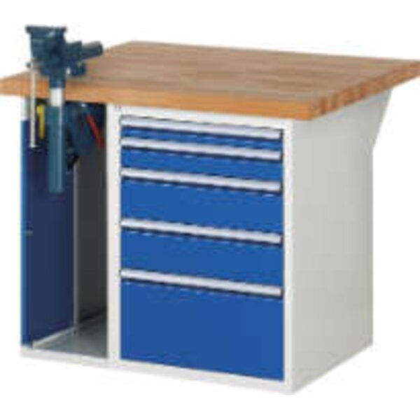 -Werkbank Serie 7000, Tiefe 900 mm, 5 Schubladen, 1 Schraubstockschrank Die Werkbänke haben die Tiefe 900 mm.
