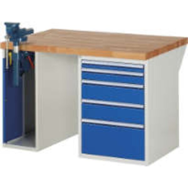 -Werkbank Serie 7000, Tiefe 900 mm, 5 Schubladen, 1 Schraubstockschrank Die Werkbänke haben die Tiefe 900 mm.