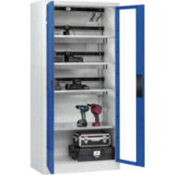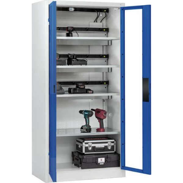 -Akkuladeschrank COMFORT, mit Sichtfenstertüren Diese Akkuladeschränke verfügen über eine stabile Stahlkonstruktion mit hochwertiger Einbrennbeschichtung.