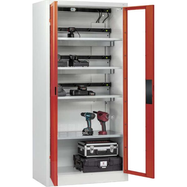-Akkuladeschrank COMFORT, mit Sichtfenstertüren Diese Akkuladeschränke verfügen über eine stabile Stahlkonstruktion mit hochwertiger Einbrennbeschichtung.