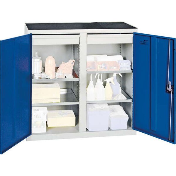 -Werkzeug- und Materialschrank Serie 2000, 2 Schubladen, 4 Fachböden und Mitteltrennwand Diese Werkzeugschränke eignen sich vor allem für Produktionsbereiche. Sie sind aus Qualitätsfeinblech gefertigt und verschweißt. Die Oberfläche ist pulverbeschichtet, unempfindlich, langlebig, schlag- und kratzfest.