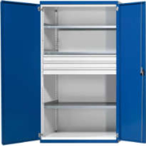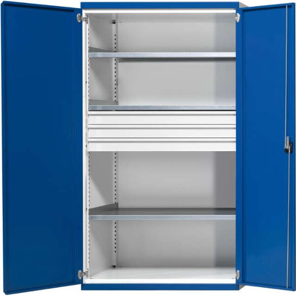 Schwerlastschrank ANKE, B1085xT690xH1950mm RAL7035/5010 o.Mittelwand3Böden,3Schubladen 200kg