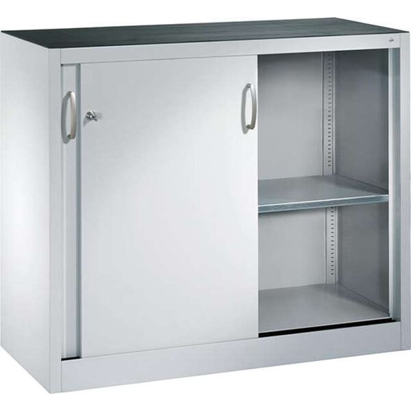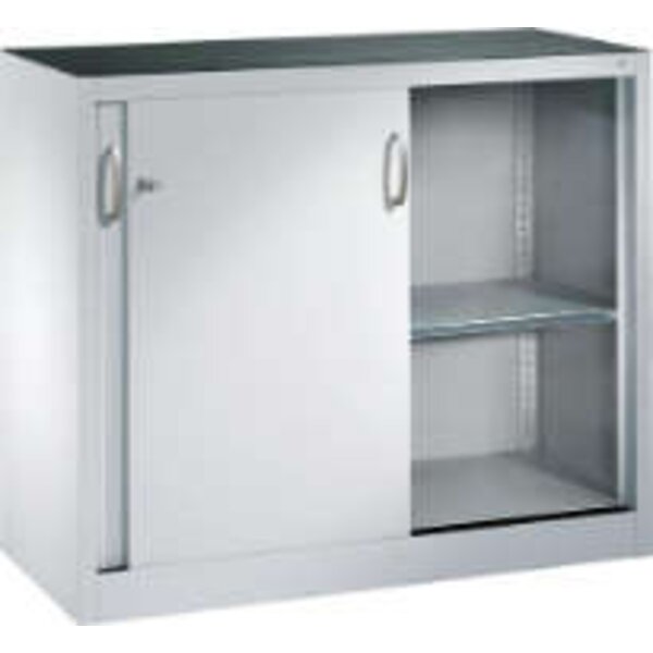 -Schiebetüren-Beistellschrank, Höhe 1200 mm Diese Schiebetürenschränke sind aus einer langlebigen Stahlkonstruktion gefertigt. Die Türen sind rollengelagert und leichtgängig.