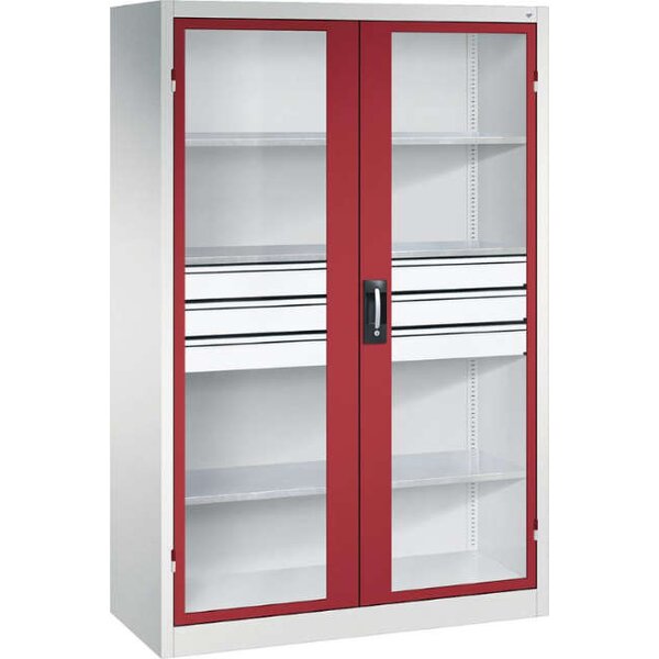 -Schwerlastschrank, mit Flügeltüren und Schubladenblock mittig, RAL 7035/3003 Diese Schwerlastschränke bestehen aus einer langlebigen und stabilen Stahlblechkonstruktion.