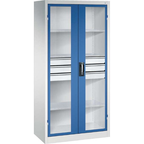 -Schwerlastschrank, mit Flügeltüren und Schubladenblock mittig, RAL 7035/5010 Diese Schwerlastschränke bestehen aus einer langlebigen und stabilen Stahlblechkonstruktion.