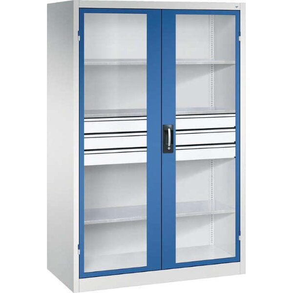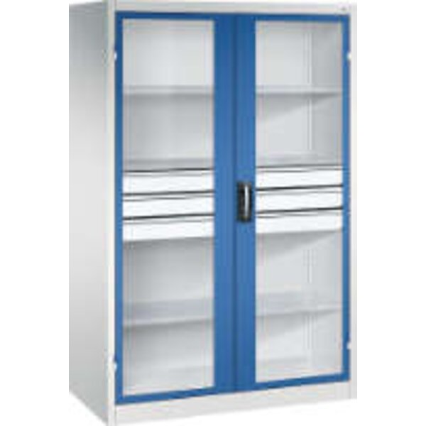 -Schwerlastschrank, mit Flügeltüren und Schubladenblock mittig, RAL 7035/5010 Diese Schwerlastschränke bestehen aus einer langlebigen und stabilen Stahlblechkonstruktion.