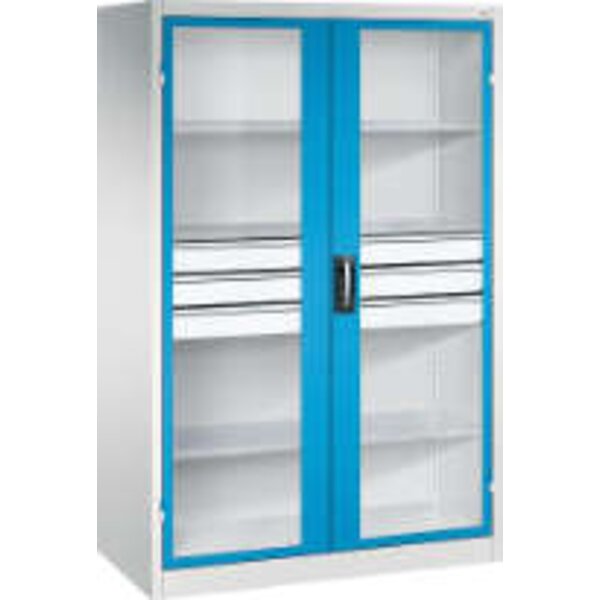 -Schwerlastschrank, mit Flügeltüren und Schubladenblock mittig, RAL 7035/5012 Diese Schwerlastschränke bestehen aus einer langlebigen und stabilen Stahlblechkonstruktion.