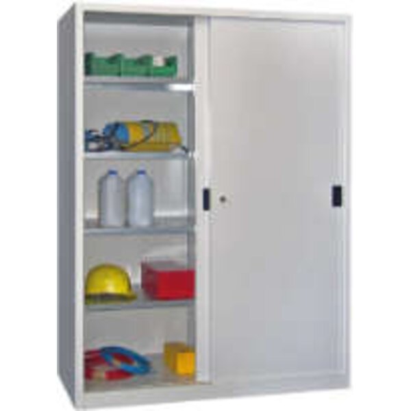 -Schiebetürenschrank mit Vollblechtüren und Mitteltrennwand, Böden verzinkt Dieser Schiebetürenschrank verfügt über eine solide verschweißte Stahlblechkonstruktion mit hochwertiger Pulverbeschichtung.
