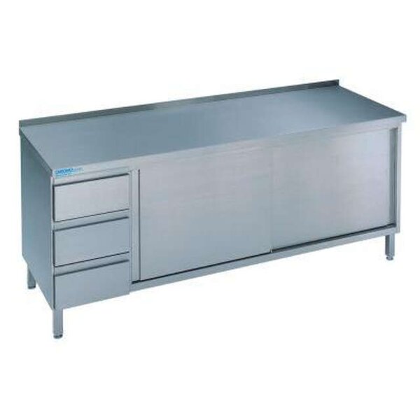 -Edelstahl-Arbeitstisch, mit Schubladenblock und Schiebetür Diese Arbeitstische sind rostfrei, robust und pflegeleicht.