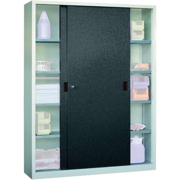 -Schiebetürenschrank mit Vollblechtüren und Mitteltrennwand, Böden gepulvert Dieser Schiebetürenschrank verfügt über eine solide verschweißte Stahlblechkonstruktion mit hochwertiger Pulverbeschichtung.