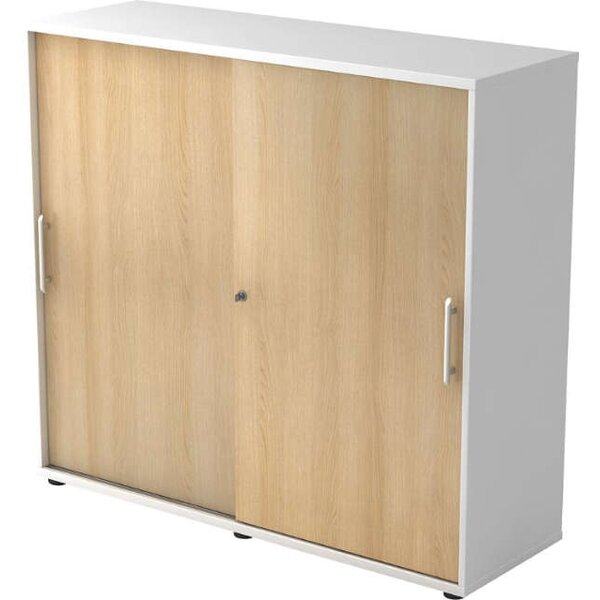 -Schiebetürenschrank Serie X mit 3 Ordnerhöhen Diese abschließbaren Schiebetürenschränke sind mit einer Mittelseite ausgestattet, die ein Durchbiegen der Platte verhindert und somit den leichten Lauf der beiden Schiebetüren garantiert.