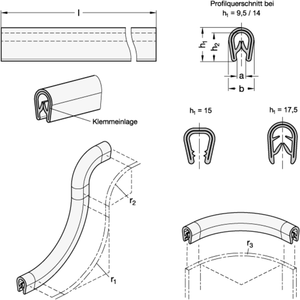 Um einen dauerhaften Sitz der Profile zu gewährleisten und um die Montage zu erleichtern wird empfohlen, die angegebenen Richtwerte für die Verlegeradien (r1 ... r3) einzuhalten. Die Montage erfolgt von Hand, alternativ mit einem Schonhammer. Die eingebettete Klemmeinlage schützt vor selbstständigem Lösen. Klebstoffe oder andere Befestigungsmittel werden nicht benötigt.