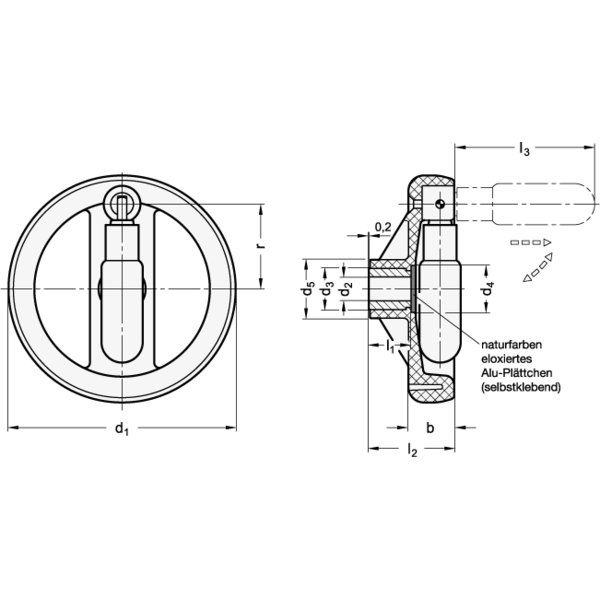 Bei diesen Handrädern ist der Griff in der Bohrung arretiert.