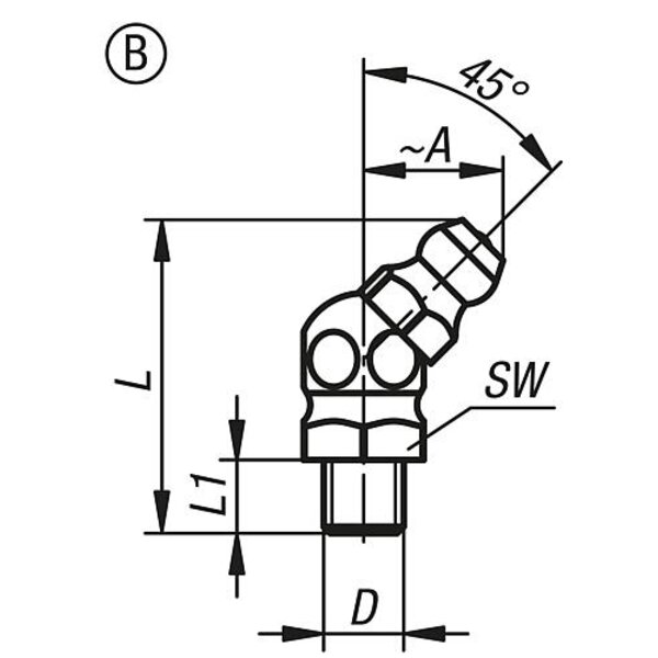KEGELSCHMIERNIPPEL DIN71412, FORM:B ABGEWINKELT 45° M. 6-KANT, M10X1, L=23, STAHL GEHÄRTET UND VERZINKT