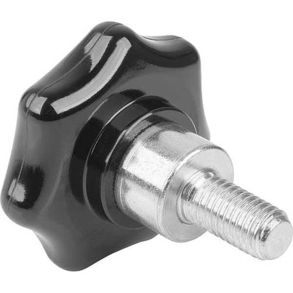 Der Sterngriff aus Duroplast zeichnet sich durch eine geschlossene Griffkontur aus. Die Anlagefläche der vorstehenden Stahlbuchse steht senkrecht zur Gewindeachse und ermöglicht eine stabile Schraubverbindung.