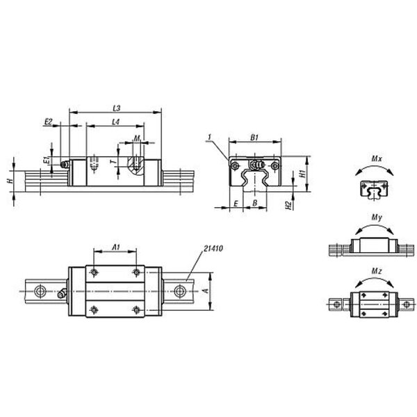 Standard Führungswagen mit Kugelumlaufführung nach Genauigkeit N ohne Vorspannung (Z0). Mit beidseitiger Abschlussdichtung. 4-reihige Ausführung mit Rundbogenprofil. Die Laufbahnen der Profilschienen sind unter einem Winkel von 45° angeordnet und können somit Belastungen aus allen Richtungen aufnehmen.
