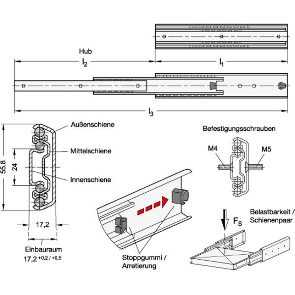 Teleskopschienen mit Vollauszug, Belastbarkeit bis 1290 N