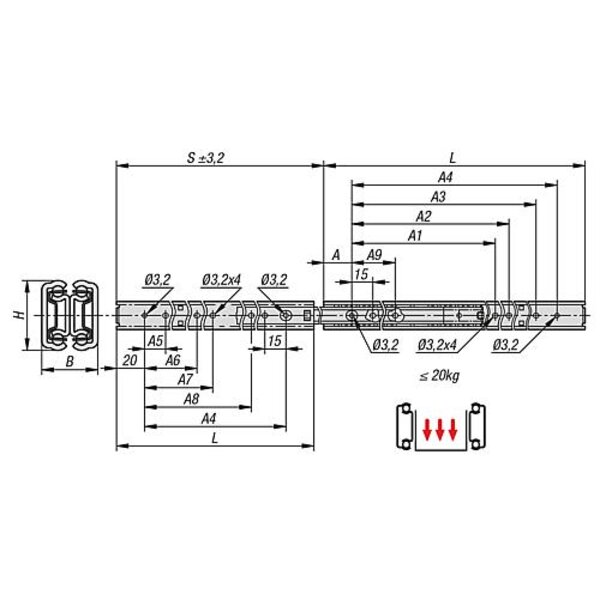 TELESKOPSCHIENE L=200 16X20, VOLLAUSZUG S=231, Fp=17, STAHL VERZINKT, MONTAGE...